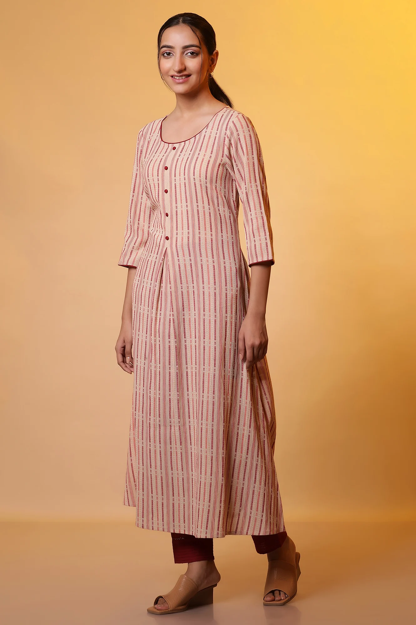 Looking for something flowy yet sophisticated? Then here is the style for you. It is a flared style kurta with inverted box pleat given as a placket with a pop of colored buttons to enhance its beauty. The fabric used is dobby with nice vibrant coloured stripe texture which gives a very nice handfeel to the pieace that falls on your body flawlessly.