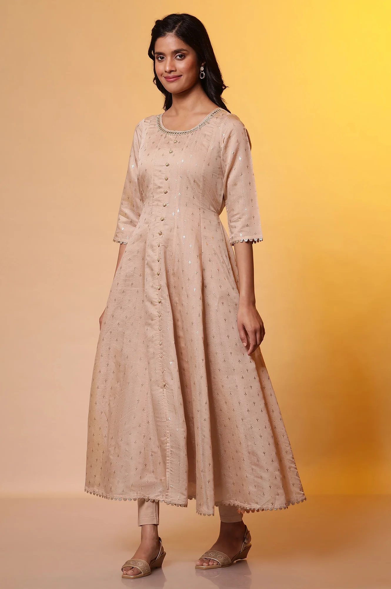 -70%Biege Embellished Anarkali Kurta, Tights and Dupatta Set—