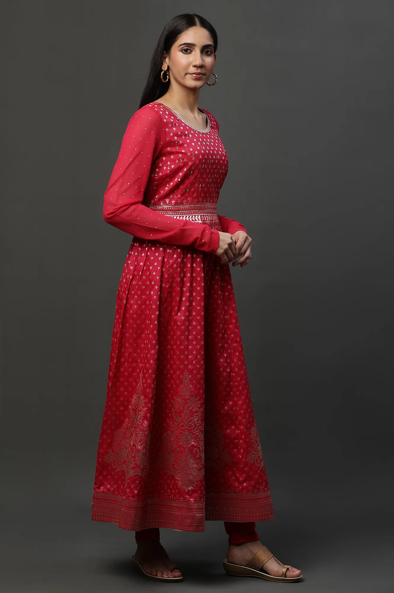Pink Embellished Anarkali Festive Kurta, Tights and Dupatta Set