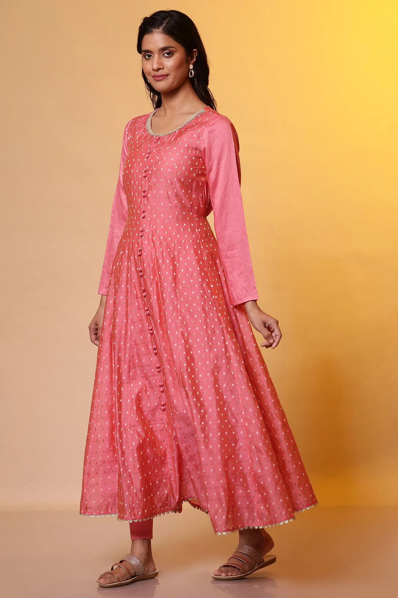Look gorgeous in this beautiful anarkali set made for all occassions. The anarkali is made in rich chanderi jacquard fabric, it has embellished round neckline, fabric buttons at front and tie-up at back. The kurta is paired with a heavy solid pink tights and banarasi brocade dupatta.