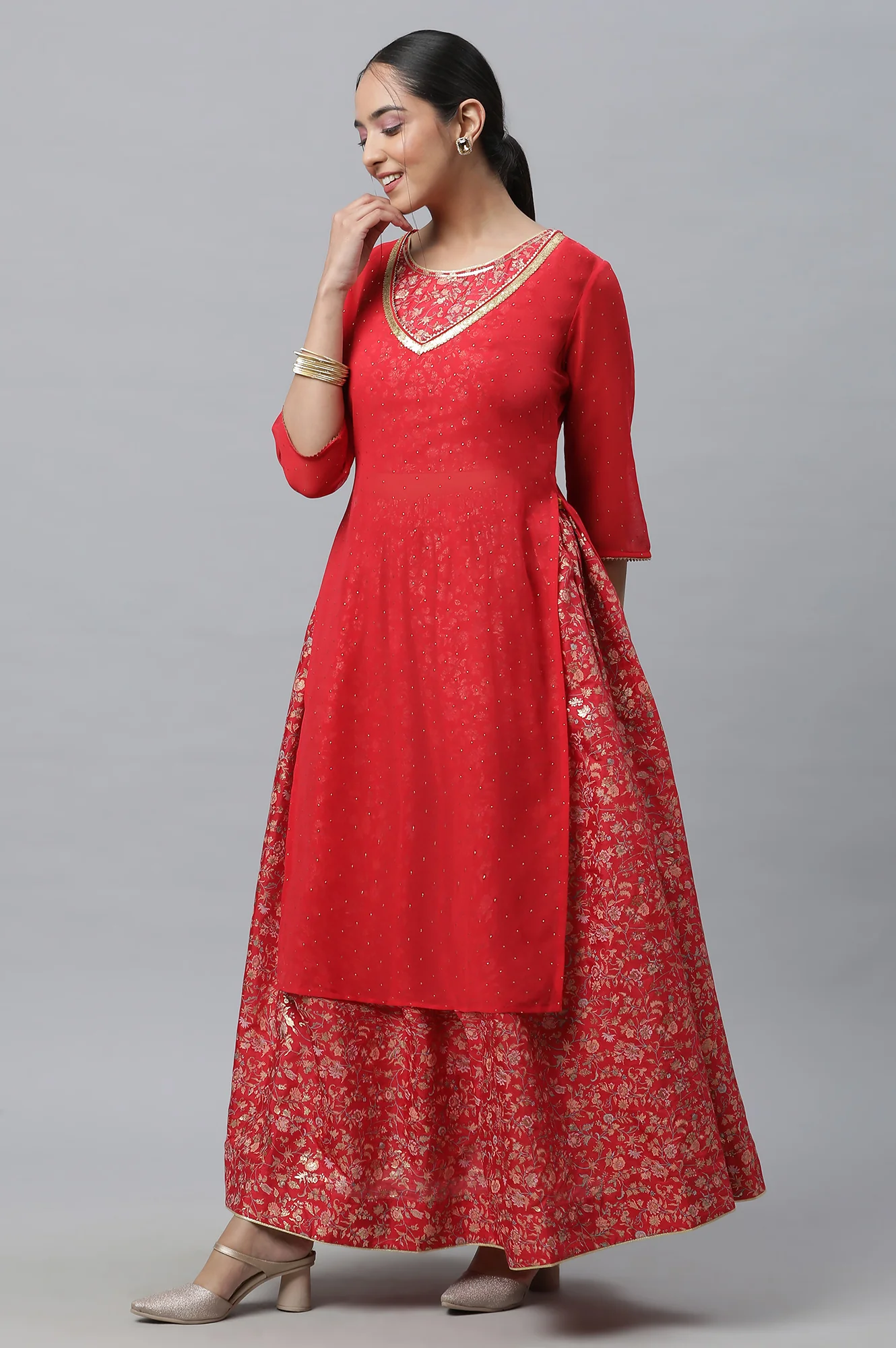 Reimagine your style with this red floral printed crop top and skirt paired with a layer of sheer v-neck kurta in georgette. The crop top and skirt are adorned with foil print and the sheer kurta has sequins and lace on V-neckline. It is a picture perfect emsamble that is sure to get you all the likes on insta.