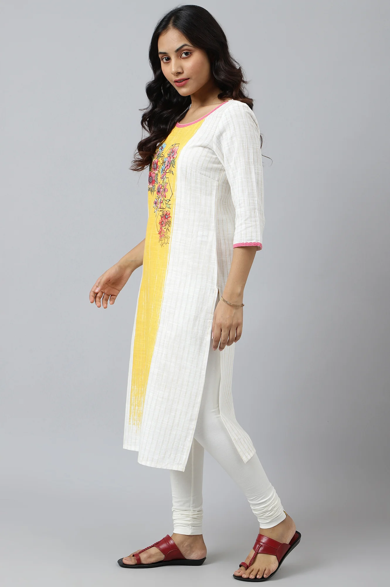-70%White Ethnic kurta with Yellow & Pink Placement Print—
