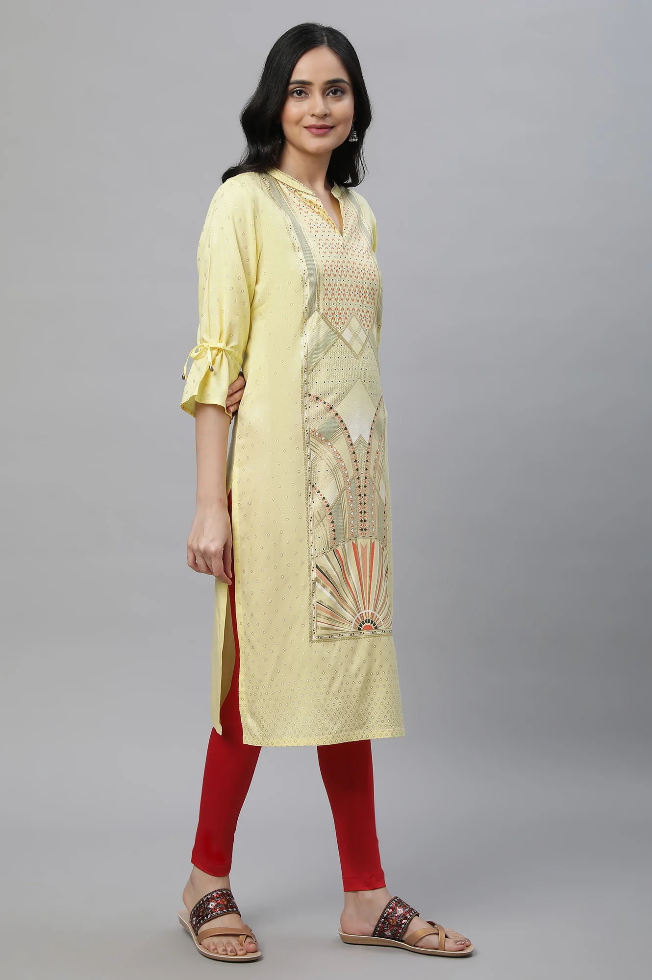 Make the statement look with this chic and elegant modern ethnic kurta. This kurta has band with V neckline and flared sleeves. It is adorned with sequins and geometric print.