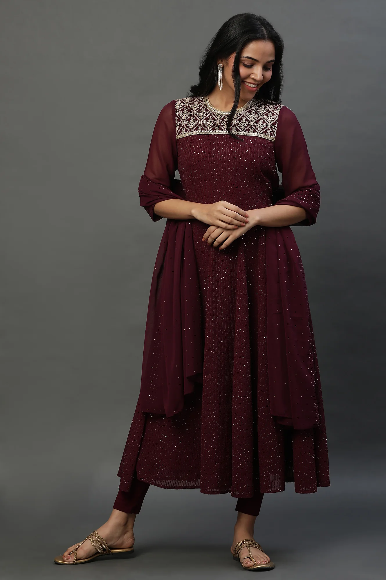 Crafted in a rich purple shade, this Anarkali kurta features detailed dori embroidery, a flared cut, round neckline, and three-quarter sleeves. It is paired with fitted tights and a matching dupatta for a complete ethnic look.