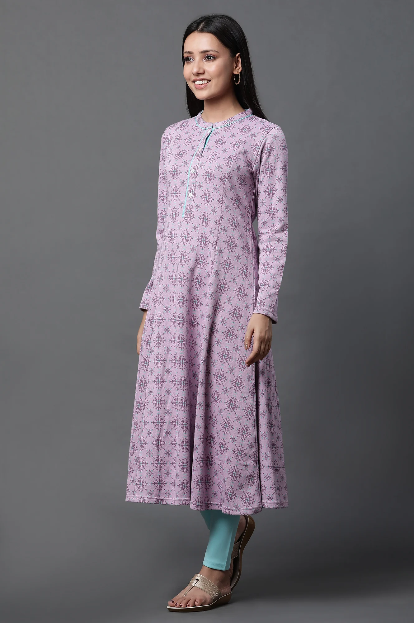 This sweet lilac kurta set with an all-over tonal jacquard and smart mandarin collar neckline detail exudes a sober and trendy vibe, making it a perfect addition to your winter wardrobe. The tonal jacquard gracefully covers the fabric, adding a touch of sophistication and visual intrigue. The smart mandarin collar neckline detail enhances the outfit's elegance and offers a refined touch. Paired with contrasting tights, it creates a coordinated and stylish look that is ideal for winter outings.