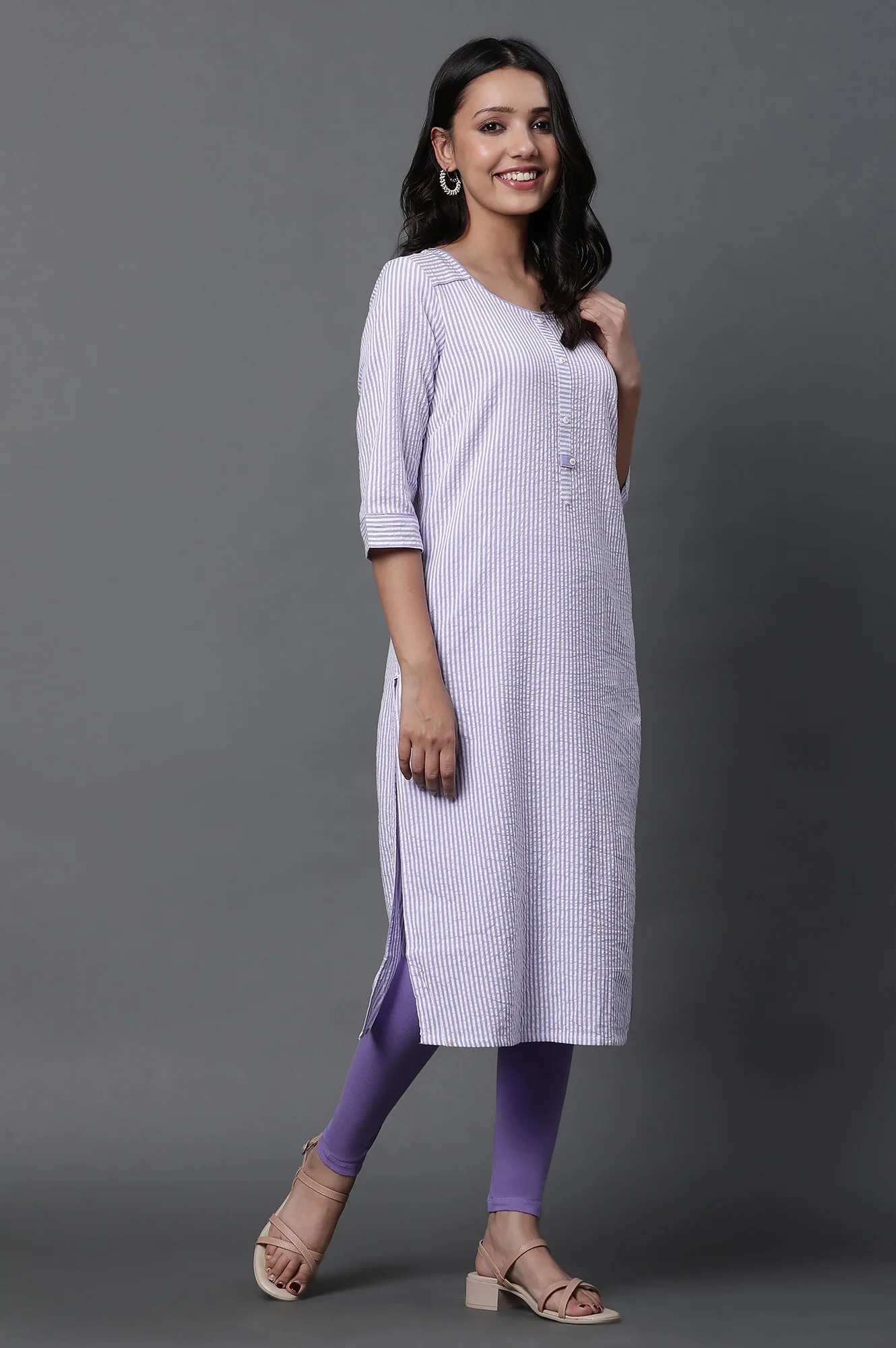 Get styled for the casual day with this simple and classy stripe printed straight kurta in round neck. It comes with purple tights and dupatta.