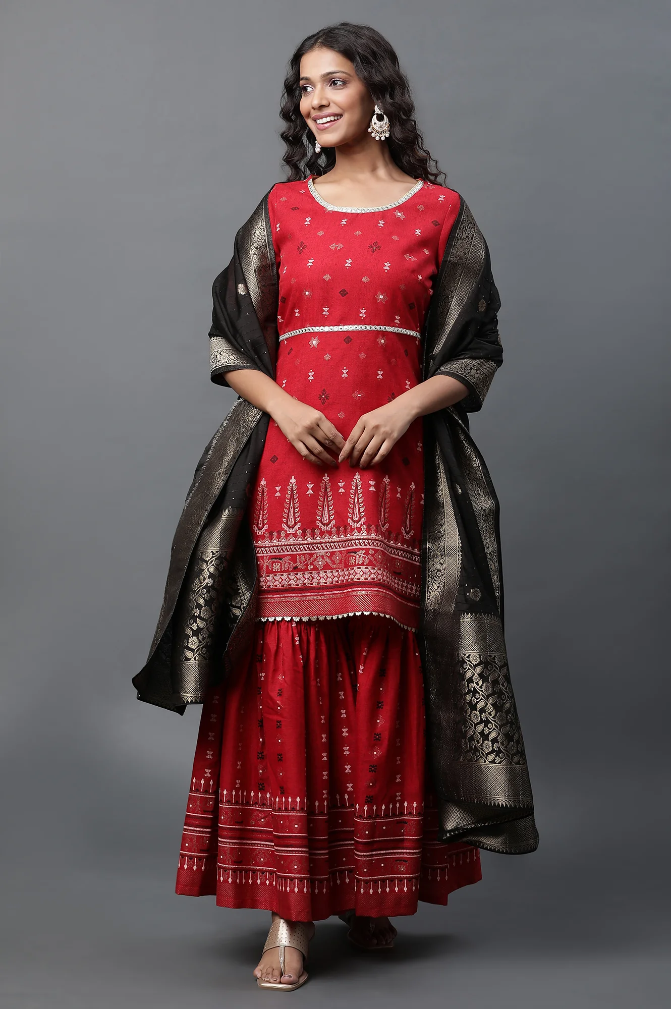 Red Mirror Embroidered Short Kurti, Sharara and Dupatta Set