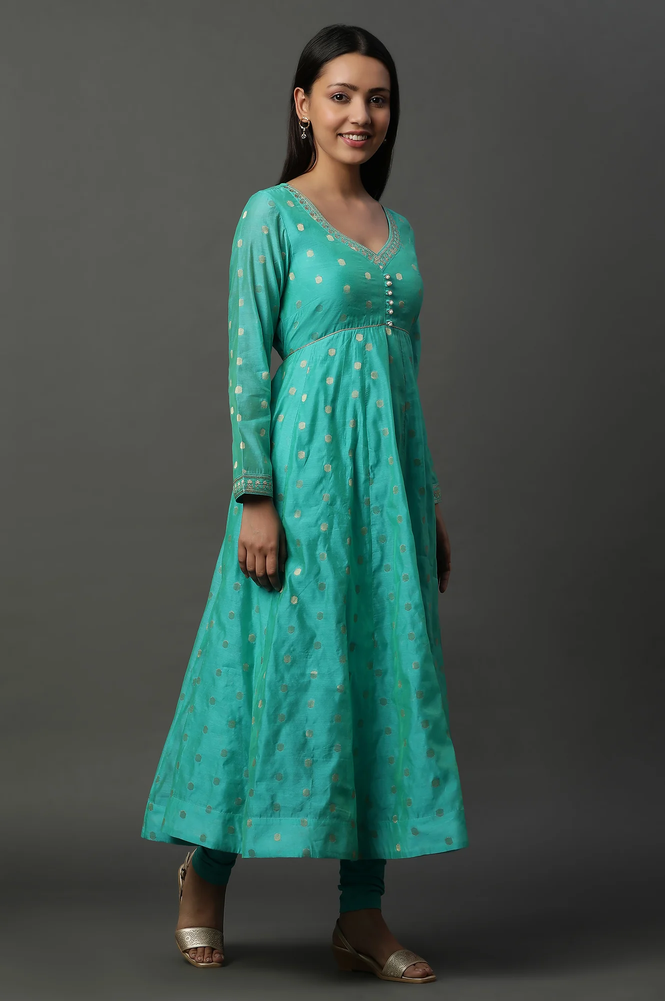 Teal Green Zari Anarkali Kurta, Tights and Banarsi Dupatta Set