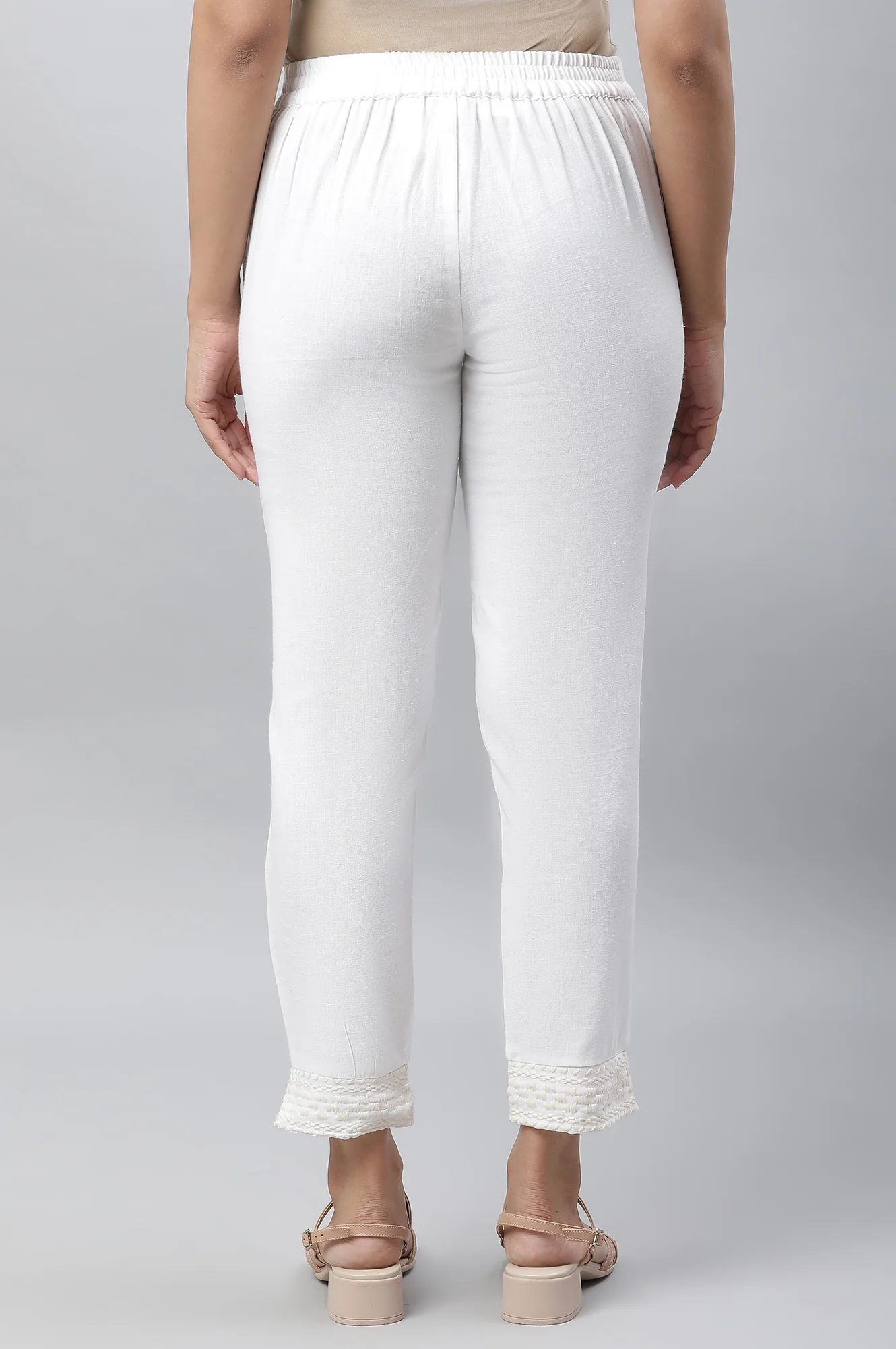 Micro-geometric precision weaving at the hemline adds a chic fashion element to your wardrobe. These trousers feature a flat front with a fully elasticized back for comfortable wear, and functional pockets on both side seams. The woven cotton fabric ensures breathability and ease, making them perfect for casual outings. Pair these stylish trousers with a kurta and block heels to complete the look.