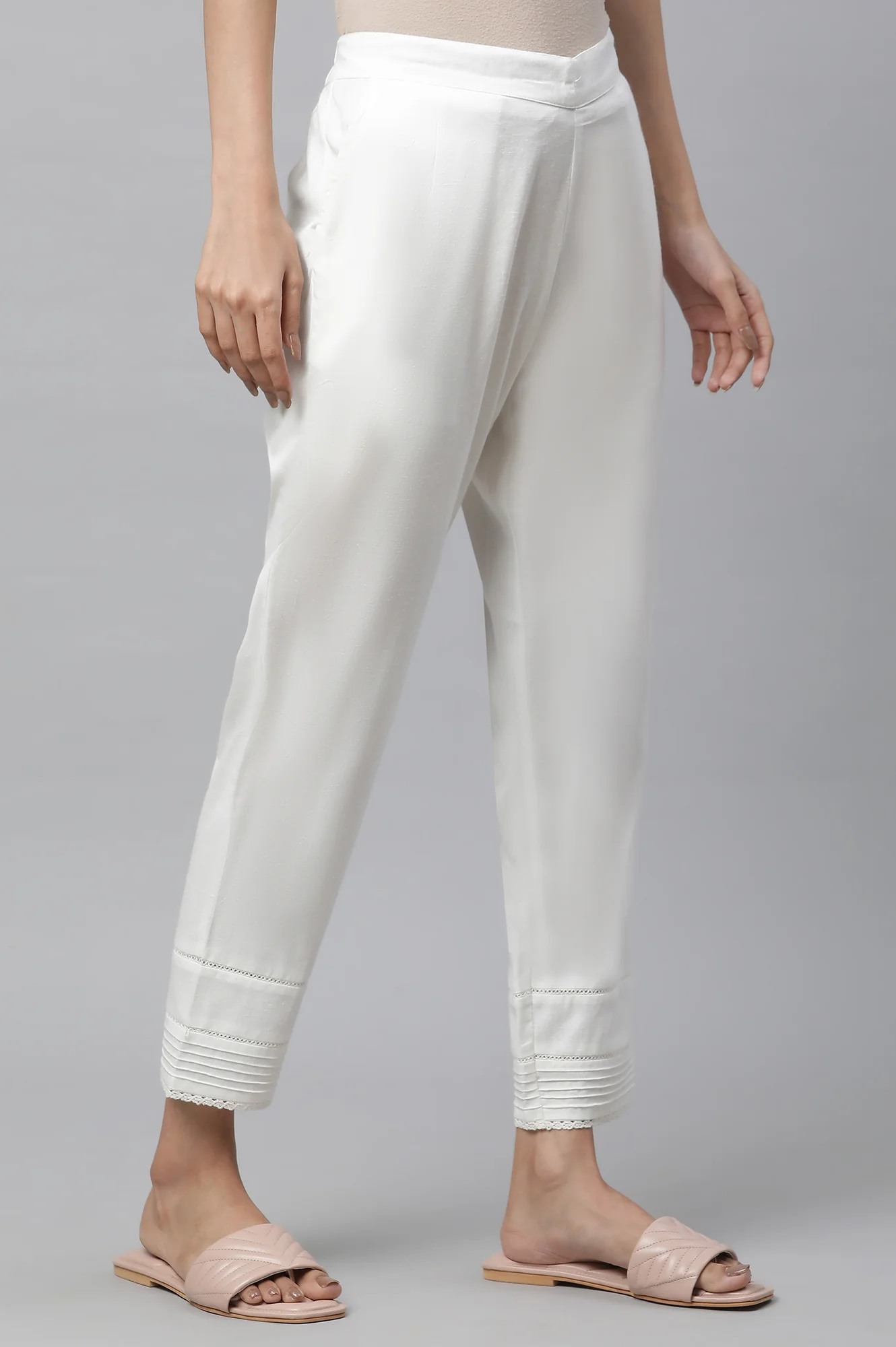 Crisp and considered, these white straight trouser pants feature refined pin-tuck detailing that elongates the leg. The cotton flax blend stays breathable while holding its shape, ideal for warm days and polished settings. A smooth waistband and discreet pockets preserve clean lines under kurtas and long shirts. The white base brightens prints and calms saturated hues, making it a capsule essential. Pair them with festive layers or everyday staples—either way, the finish remains refined. Crafted for everyday ease and polished styling. Balanced design keeps it comfortable and versatile. Made to pair seamlessly with ethnic favorites. Thoughtful finishing delivers a neat, flattering look. A dependable choice for work, outings, and festivities. Lightweight construction supports day to evening wear. Designed for mix-and-match wardrobes that work hard. Perfect for building chic, repeatable outfits.