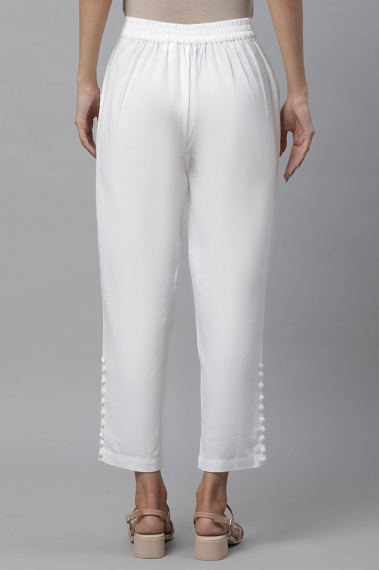 White Solid Straight Fit Cotton Trousers With Button Detail