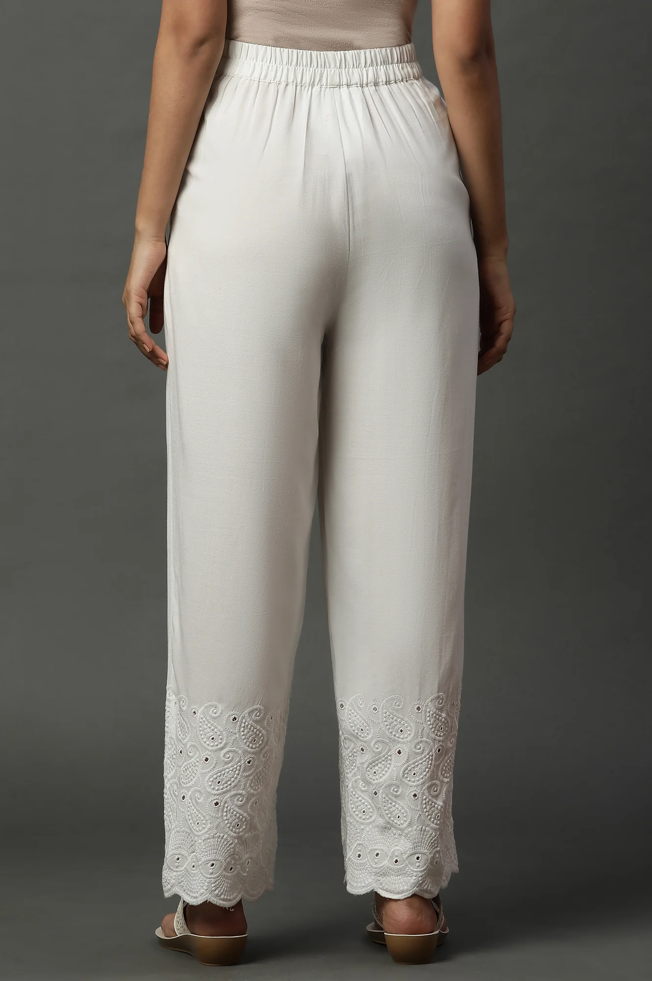 White Schiffli Embroidered Narrow Palazzo