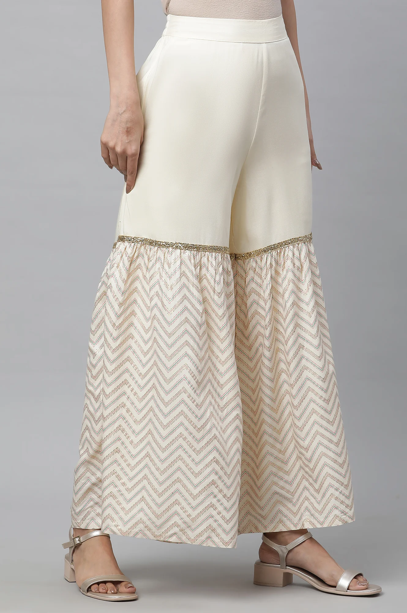 Rock These Foil Printed Single Tiered Liva Sharara Like Nothing Else. With An Easy Pull-On Silhouette And Elasticated Waistband At The Back, Making Them An Ideal Pick For On-The-Go Days.