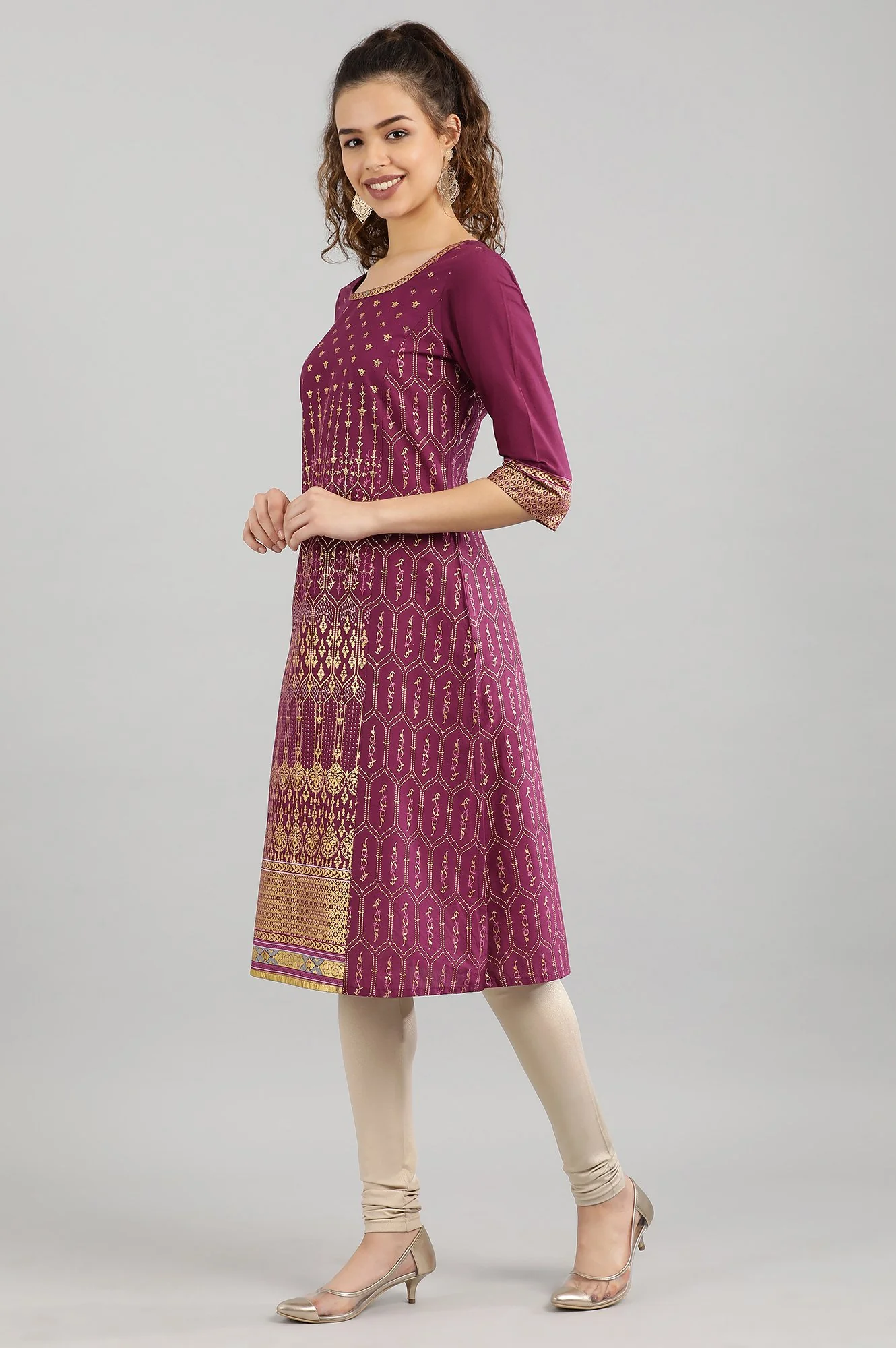 Wine Straight Printed Kurta In Band Collar And 3/4Th Sleeves.