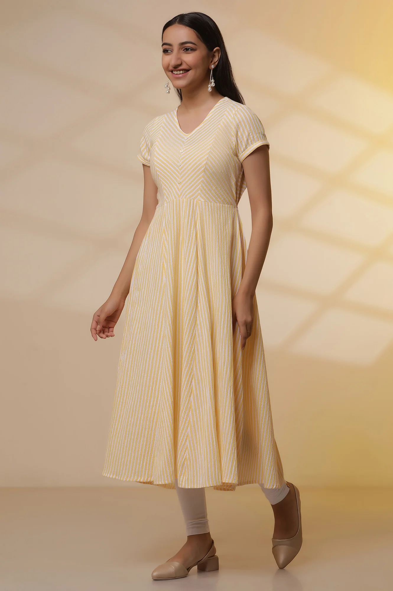 Yellow and White Striped Cotton Lurex Flared Kurta and Tights Set