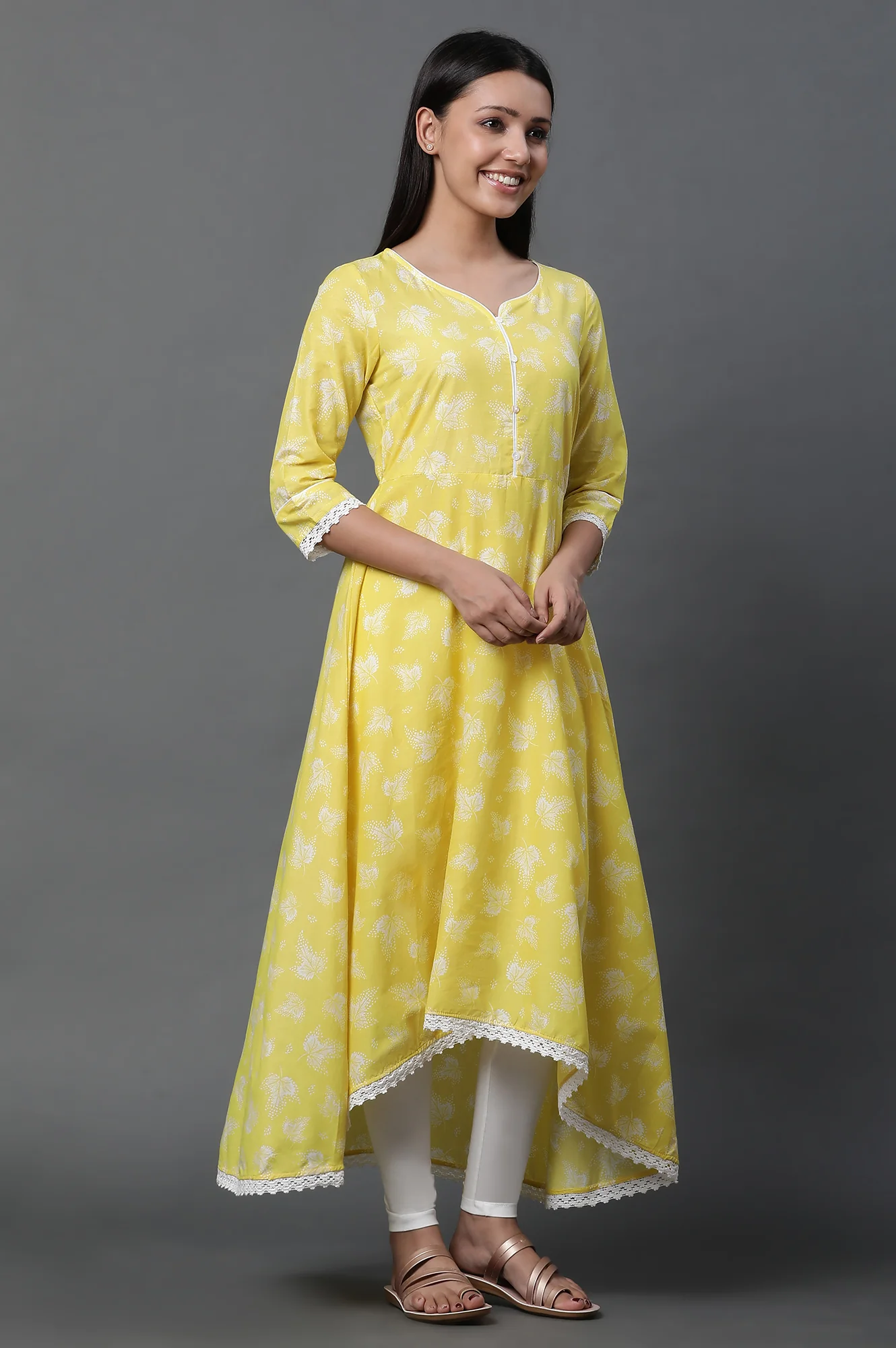 Yellow Asymmetrical Kurta, Tights and Dupatta Set