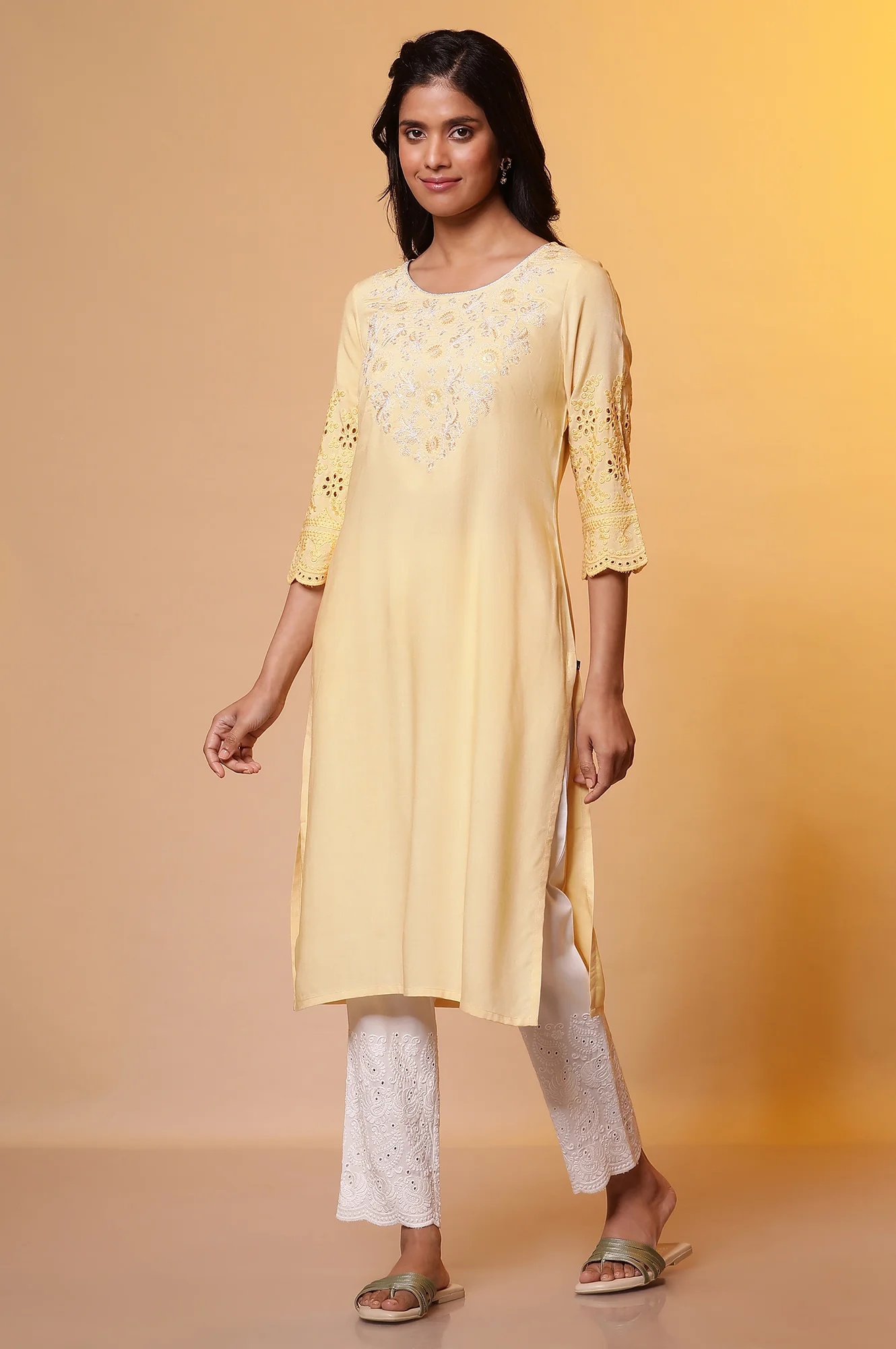 An intricate embroidered kurta in a soothing pastel yellow colour. The kurta comes with schiffli borders at sleeve and round neckline with contrasting piping which looks very elaborate and beautiful.