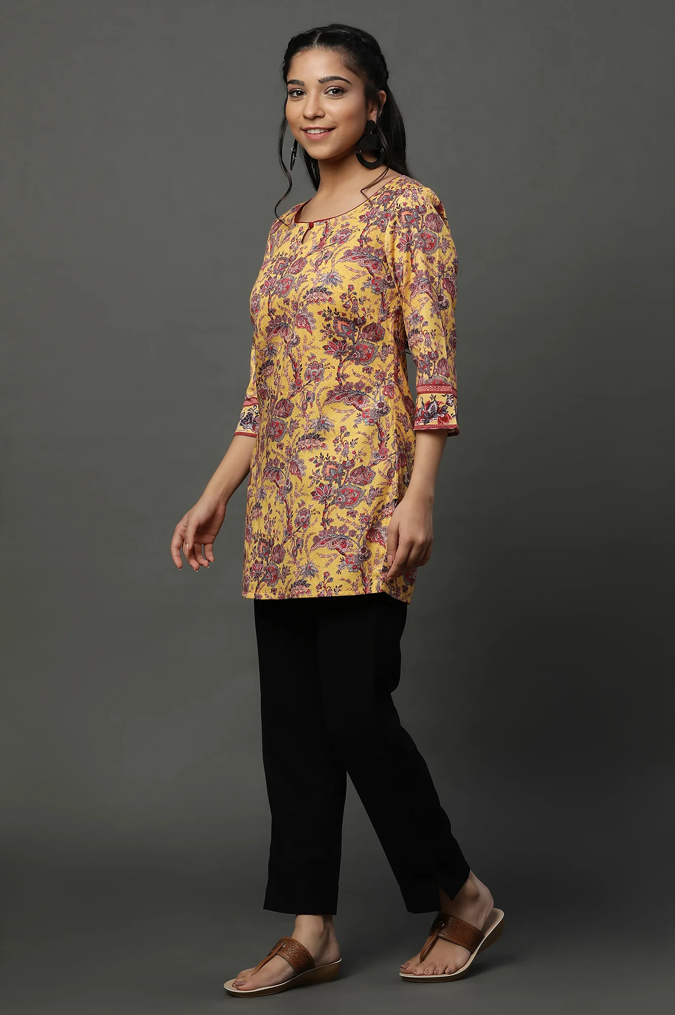Ethnic kurti add polish and relevance to this design. Brighten your casual wardrobe with this yellow floral printed kurti in an easy short length. The cheerful palette lifts every look, while breathable construction keeps you comfortable through warm afternoons. The relaxed cut styles effortlessly with slim pants or denim for a fresh, modern mood. This kurti for women blends playful prints with practical design, making it perfect for work-from-home days, errands, or coffee dates. Minimal finishing ensures a neat line, and the soft handfeel invites repeat wear. Add this breezy piece to your rotation for days when effortless colour and comfort are the priority. This elegant piece balances comfort and style for daily wear. A versatile choice that pairs beautifully with your wardrobe. Refined detailing keeps it timeless and easy to style. Elevate everyday dressing with a polished, feminine finish. This elegant piece balances comfort and style for.