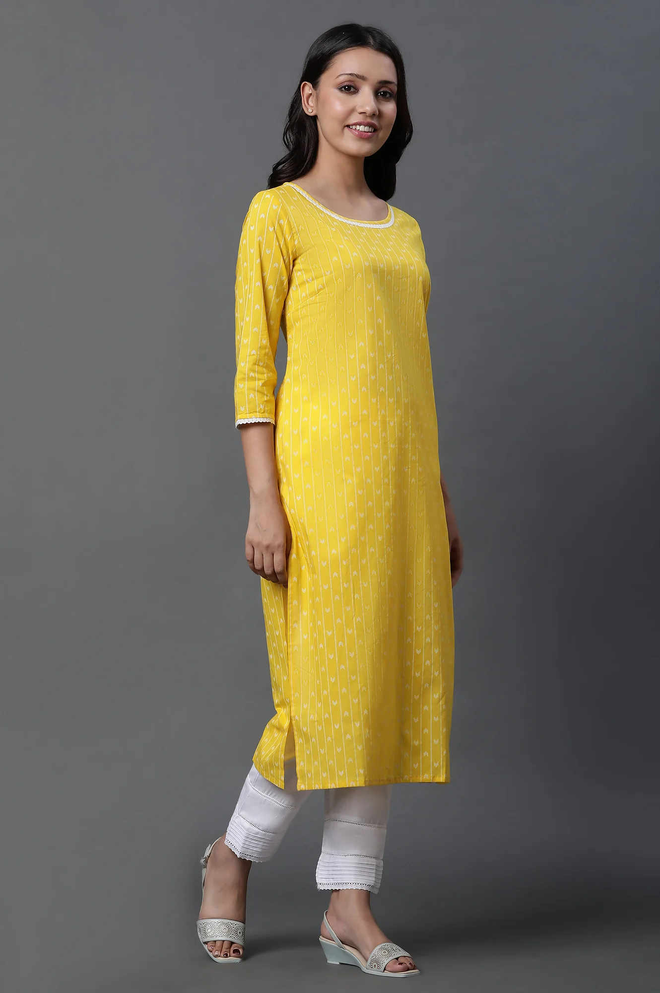 Get styled in this yellow straight kurta set. The set has round neck kurta with lace and geometric print. It is paired with white pintuck trouser pants and dupatta.