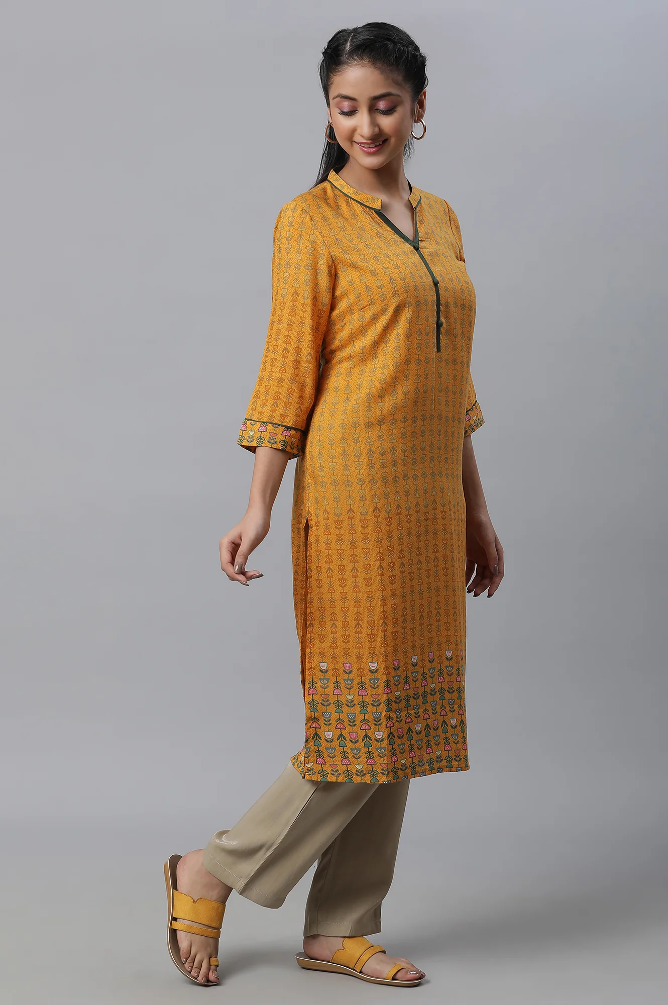 Get Styled For Your Casual Summer Day Look In This Chic Aurelia Kurta. It Is Styled In Straight Silhouette And Comes In Band Collar With V Cut And Also Features Contrasting Green Piping.