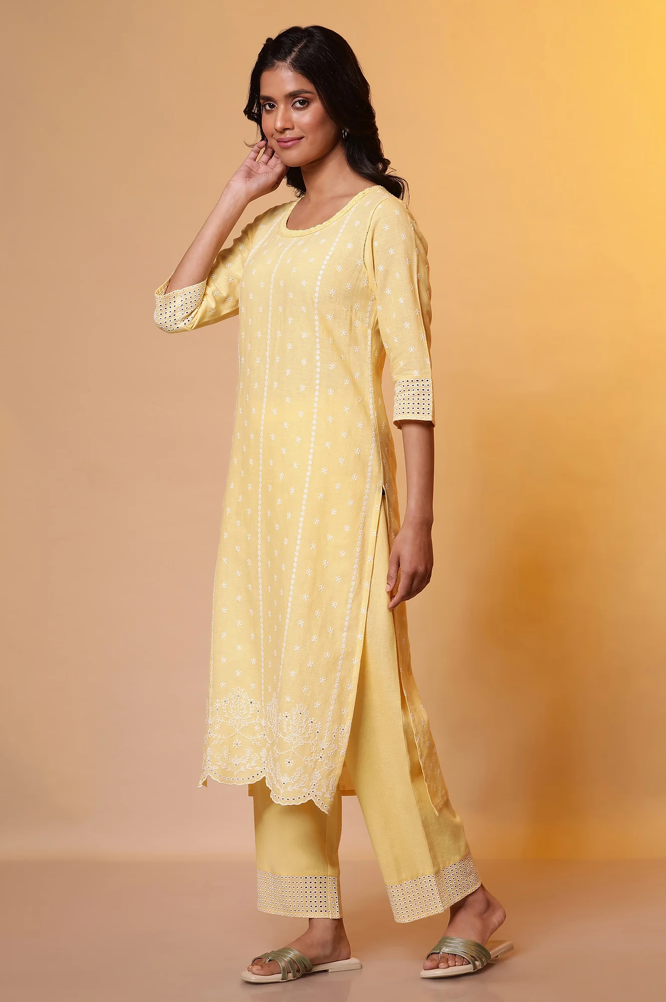 Yellow Schiffli Embroidered Kurta, Pants and Dupatta Set