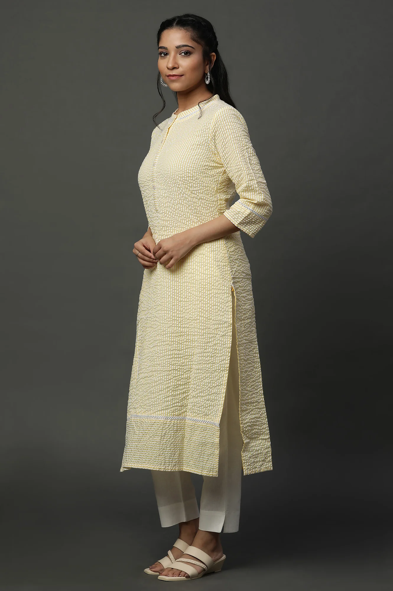 A straight kurta crafted from delicate seer sucker fabric in soothing yellow and white hues, it gives a sense of elegance. The classic mandarin collar and a front placket adorned with tasteful buttons create an aura of sophistication. The element which truly sets this ensemble apart is, the intricate lace insert at the collar, sleeve and hem of the kurta. Every detail whispers a story of refined taste, making it the ideal choice for work or casual wear.