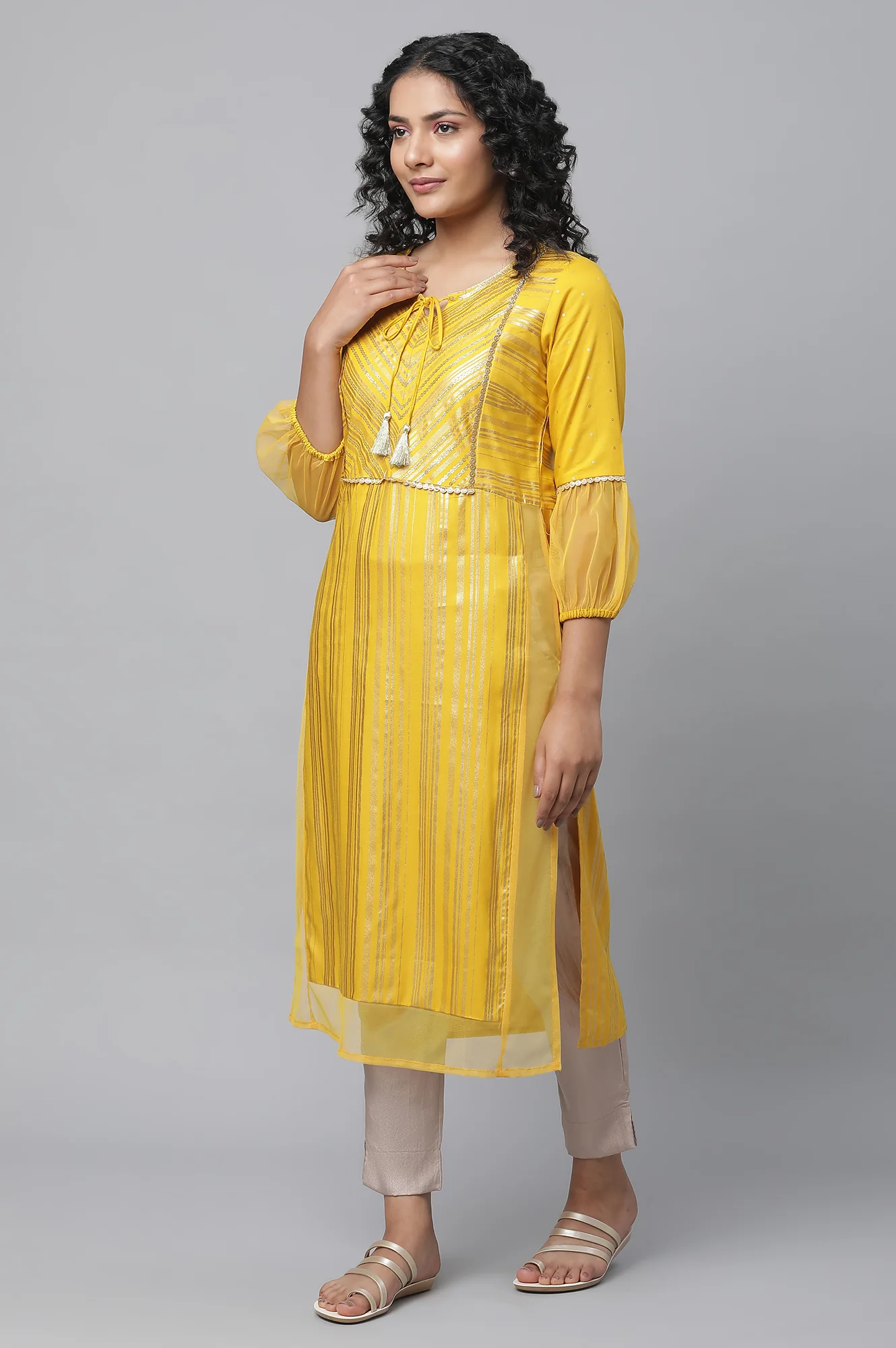Make A Stunning Entrance At Any Event In Our Mustard Colour Stripe kurta Featuring Sequin Embroidery At The Yoke. With Sheer Pannel And Tassel Tie Up Detail This kurta Looks Perfect Look Festive Season
