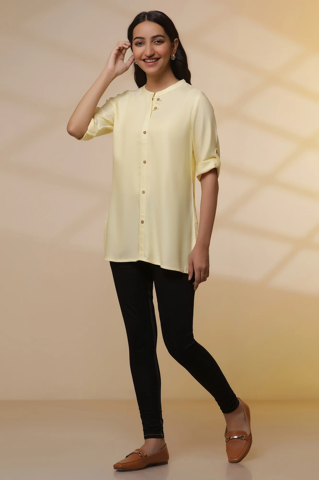 Simple and timeless, this melange twill top and denim jeggigns is a wardrobe staple. It comes with a neat and crisp mandarin collar and wooden buttons on the placket. The top is paired with blue denim jeggings.